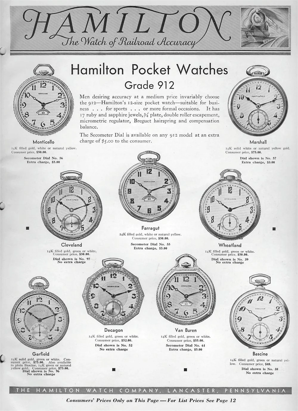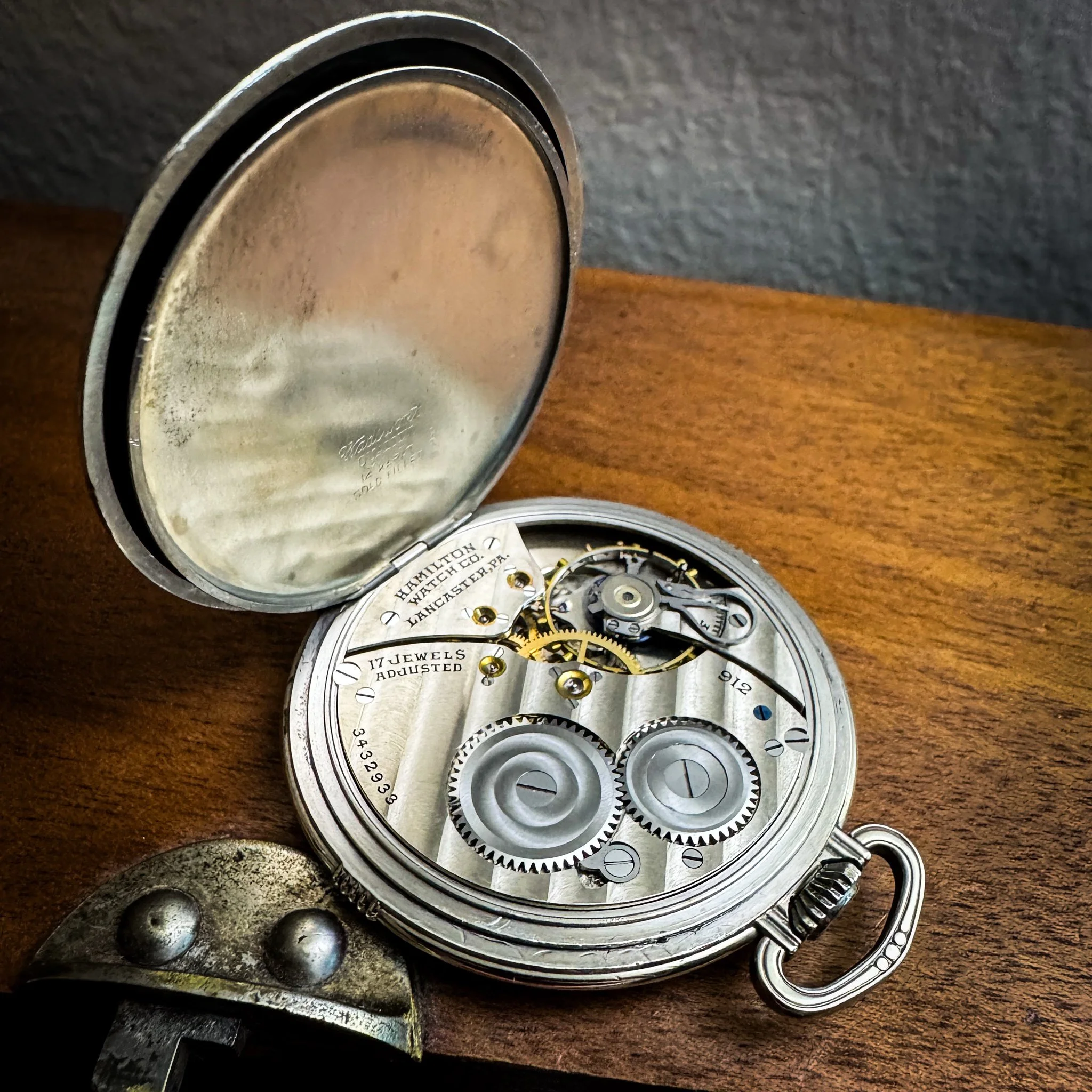 The Hamilton cal. 912, cased in a white gold-filled Farragut pocket watch case. Image compliments of Brendan Frett.
