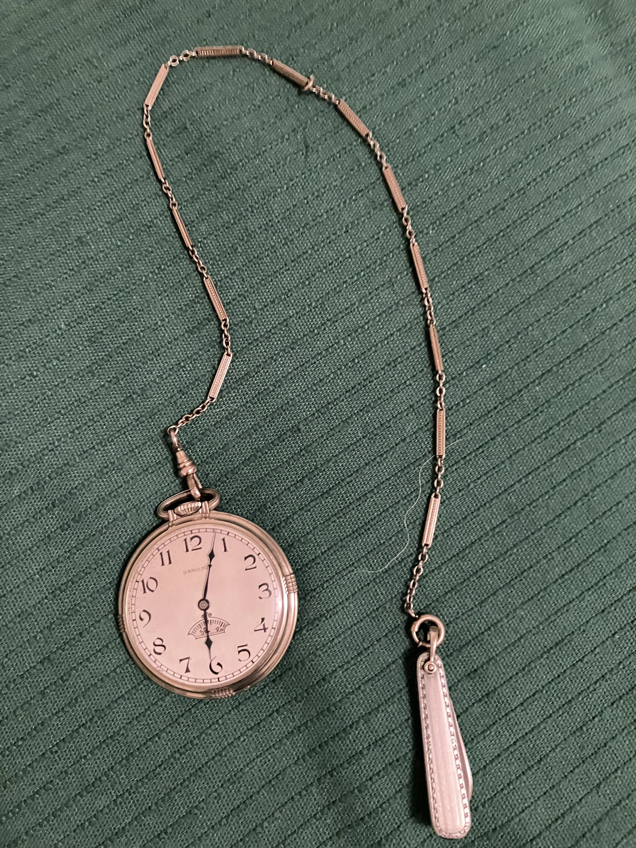 It was still attached to its pocket chain and pen knife fob, posed against a bed spread that dated to her childhood. I looked at the quick & dirty picture she attached and was immediately intrigued. It appeared to be in mint condition, and the short story was that the watch had belonged to her grandfather, the late Dr. Frank DeRose, DDS.